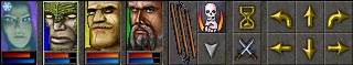 Control bar has faces of your heroes on the left side, controls for active hero in the middle and walking arrows on the right side.